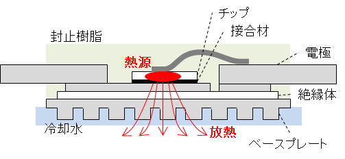 パワーモジュールはスイッチングのON/OFFによってチップ発熱による温度上昇→冷却水への放熱による温度低下という繰り返し温度サイクルに晒され、このとき異なる材料間の界面では線膨張係数の違いにより繰り返し熱応力が生じます。これにより接合材やワイヤボンディングにダメージが蓄積され、やがて熱疲労による破壊につながります。