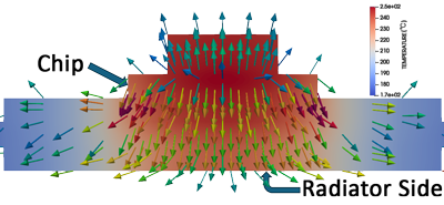 ・チップ発熱時の温度分布と熱の流れ: どのような放熱経路となっているか、どの材料が放熱の妨げとなっているかを確認することができます。