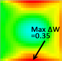 チップ接合材の⊿Wは外周部で最大値となっており、ここから破壊が生じることがシミュレーションから予測されます。