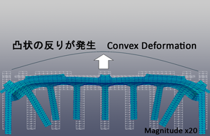 変形図は接合後の変形を20倍に強調したもので、その断面を見ると上に凸の形状の反り変形が生じていることや反り量の大きさがわかります。