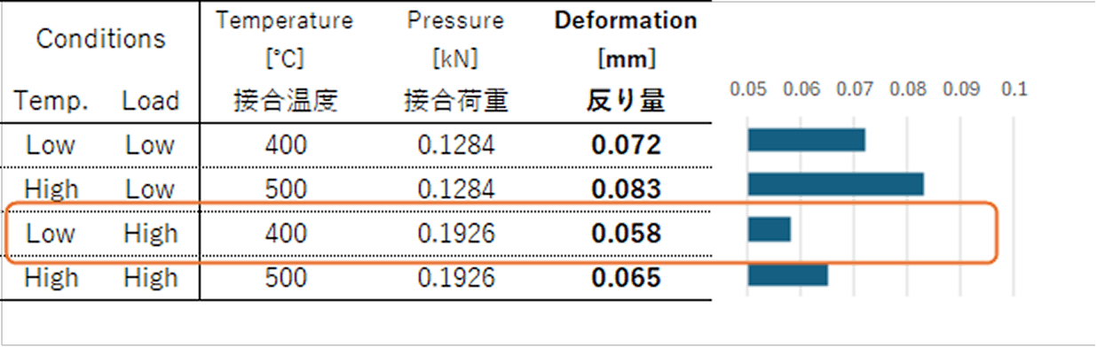 ここでは反り量に対する「接合温度の変更」「接合荷重の変更」の効果を評価しました。その結果、低温、高荷重の条件で接合を行った場合に反り量が最小となることが分かりました。このようにシミュレーションで最適な接合条件の組み合わせを効率的に求めることができます。