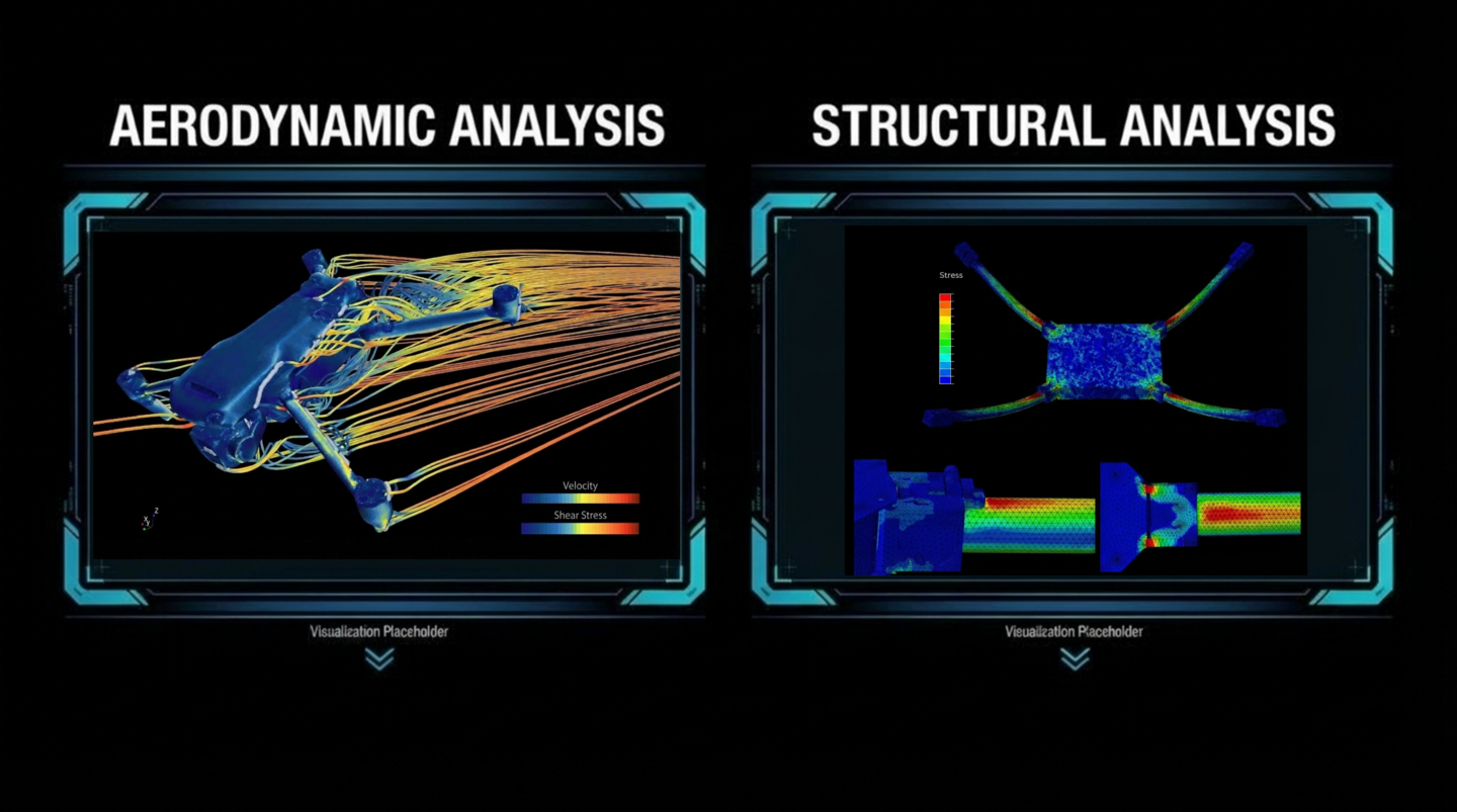 CFDによるプロペラ効率の最適化や、FEMによる機体軽量化。空力特性と構造強度の両面から最適設計を実現。