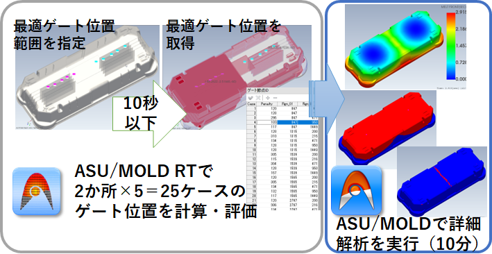 樹脂射出成形における時刻歴流動経路予測を、製品形状・注入位置・注入量比率の影響にフォーカスした弊社独自の計算アルゴリズムにより、リアルタイムレベルでの予測が可能となりました。 方案初期検討の他、ASU/MOLDとのシームレスな連携により、詳細解析を行うケースを素早く絞り込み、リードタイムを短縮します。